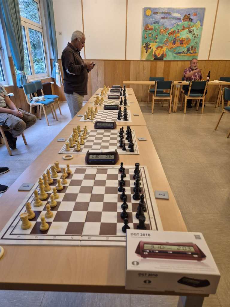Gesagt! Getan! An unserem Spielabend am 04.08.2025 war es dann soweit. Wir bildeten zwei Gruppen a 4 Spieler, die jeweils an 6 Brettern gegeneinander antraten. Also erst mal alles vorbereiten. Tische und Bretter aufbauen. Die 8 Spieler möglichst gleichmäßig auf die zwei Gruppen aufteilen.